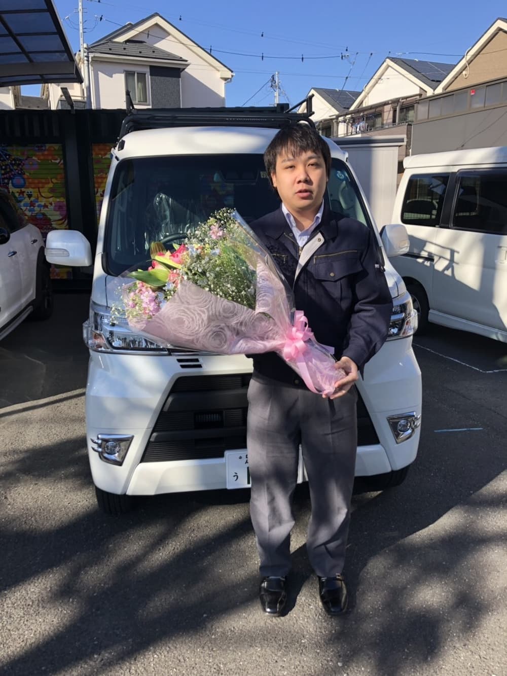 新車ダイハツハイゼットのご購入ありがとうございます。会社のご発展・皆様のご多幸をお祈りしております。安全運転を心がけてください。