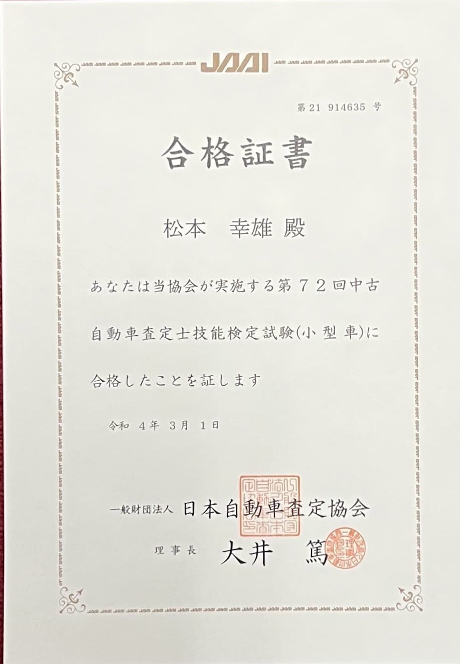 当社の松本部長が「中古自動車査定士」の免許を取得しました。