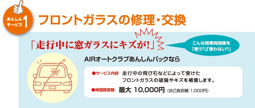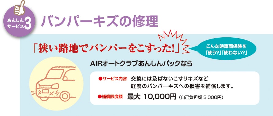 ●あんしんサービスを利用する際は、自動車保険に加入したAIRオートクラブ会員工場に入庫して修理を行うことが条件となります。